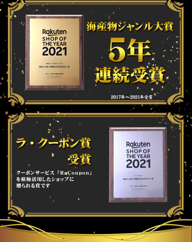1998年からスタートした「Shop of the Year」。約55,000店舗以上を誇る楽天市場の中から2021年度の客様による得票数、本年度の売上、注文件数、売り上げの伸張率、お客様対応などから、総合賞、ジャンル賞、サービス賞、特別賞を決定する、楽天市場で最も栄えある賞です。
