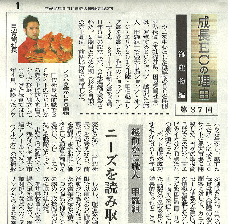 日本流通新聞社発行の「日本ネット経済新聞」2月28日号第1面で、弊社運営サイト【越前かに職人 甲羅組】が紹介されました。