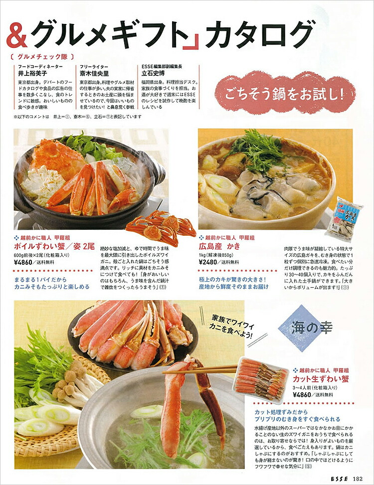 フジテレビジョン発行の情報誌「ESSE」の“ごちそう鍋&ギフトカタログ”のコーナーで、弊社が販売する【カット生ずわい蟹】【ボイルずわい蟹/姿】【ジャンボ広島かき】が紹介されました。