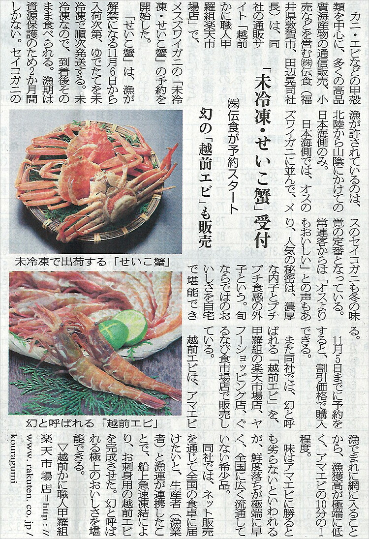 株式会社水産経済新聞社発行の「水産経済新聞」10月7日号第1面で、弊社が販売する【越前せいこ蟹】【越前がらえび】が紹介されました。