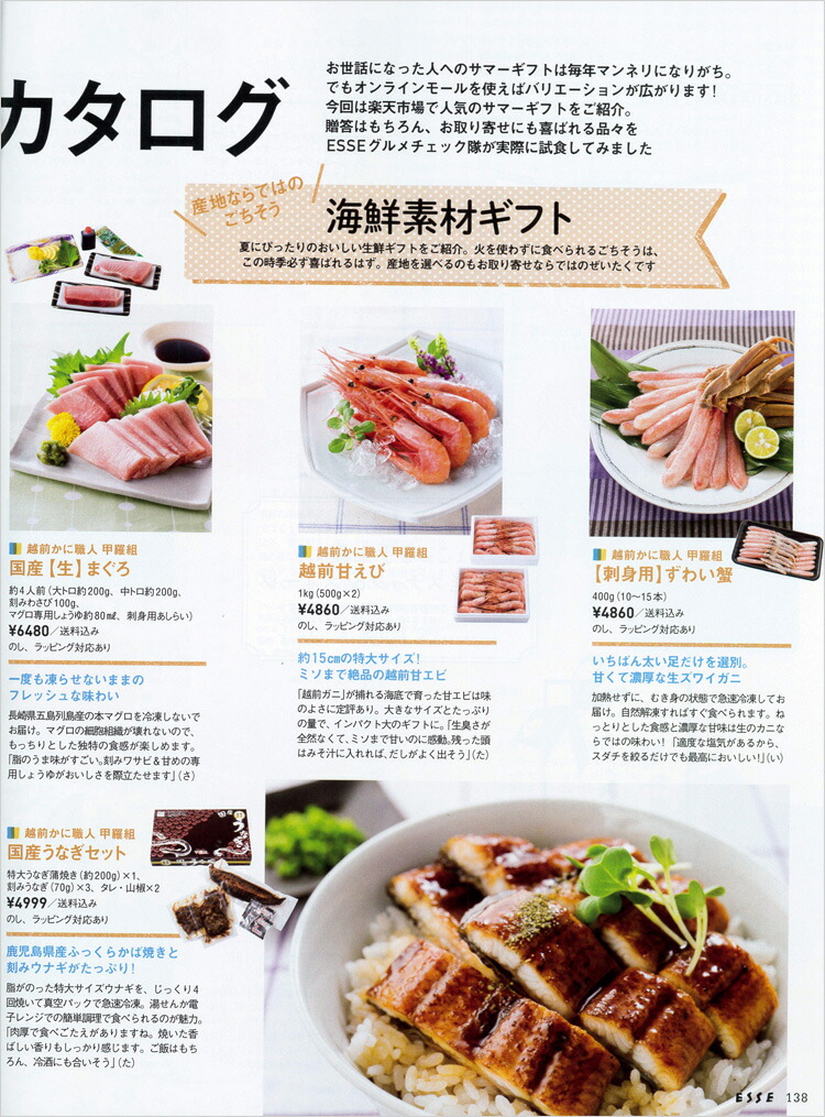 フジテレビジョン発行の情報誌「ESSE」の“夏のギフトカタログ”のコーナーで、弊社が販売する【鹿児島うなぎ】【生本マグロ】【越前甘えび】【かに刺身】が紹介されました。