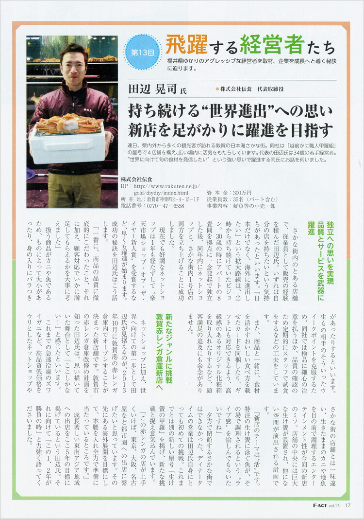 ふくい産業支援センター発行の情報誌「F-ACT」の飛躍する経営者たちのコーナーで株式会社伝食が紹介されました。
