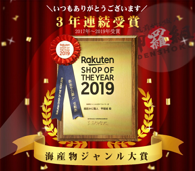 1998年からスタートした「Shop of the Year」。5万店舗以上を誇る楽天市場の中から2019年度の客様による得票数、本年度の売上、注文件数、売り上げの伸張率、お客様対応などから、総合賞、ジャンル賞、サービス賞、特別賞を決定する、楽天市場で最も栄えある賞です。