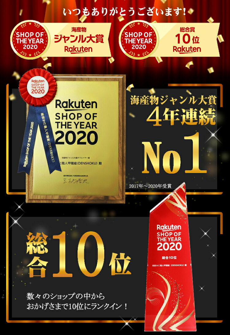 1998年からスタートした「Shop of the Year」。5万店舗以上を誇る楽天市場の中から2020年度の客様による得票数、本年度の売上、注文件数、売り上げの伸張率、お客様対応などから、総合賞、ジャンル賞、サービス賞、特別賞を決定する、楽天市場で最も栄えある賞です。