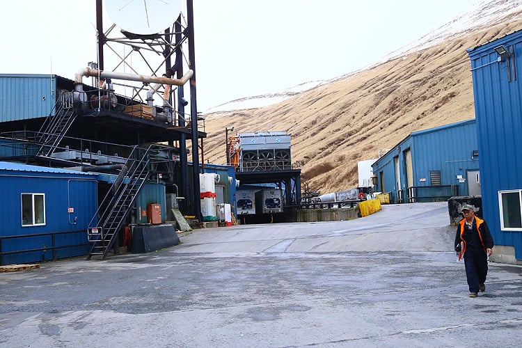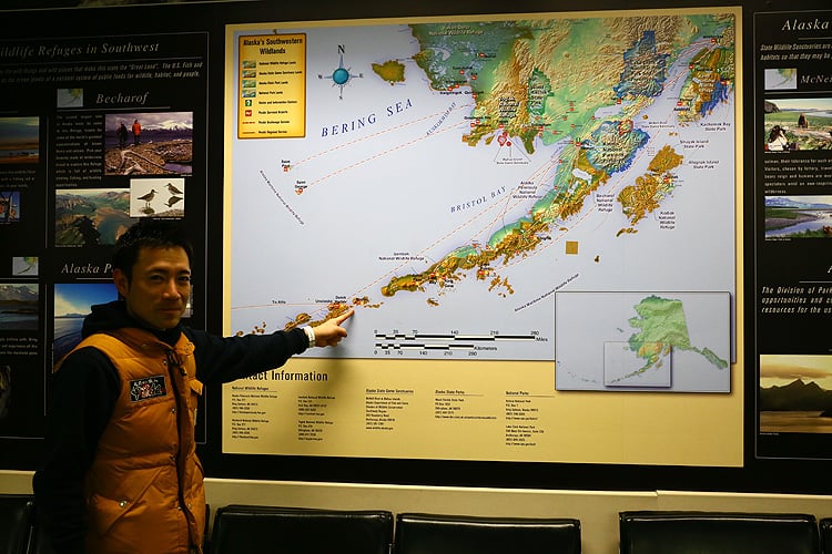写真右上の端がアンカレッジで、店長@田辺が指をさしているところがダッチ・ハーバーです。