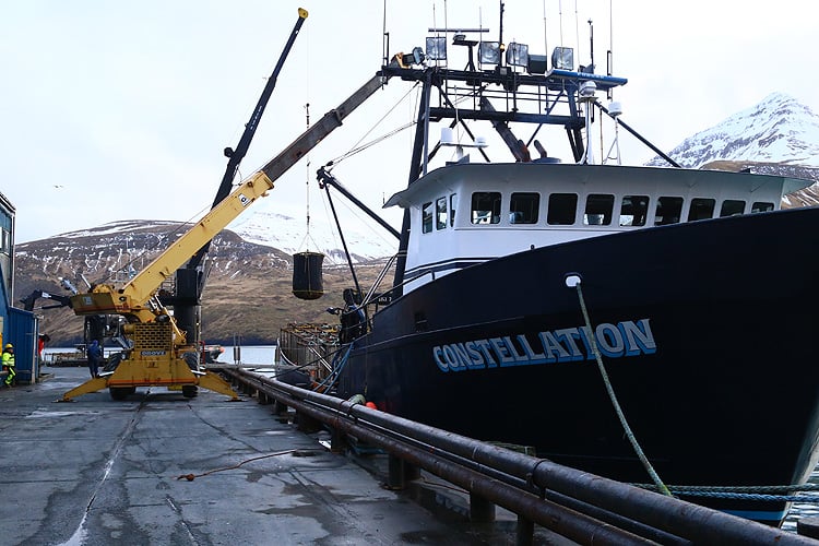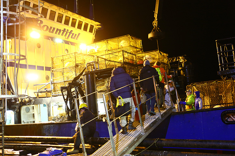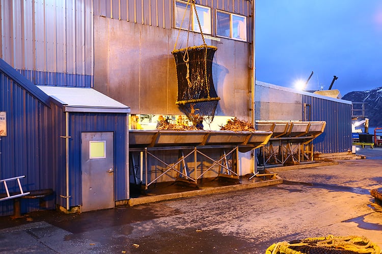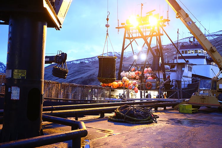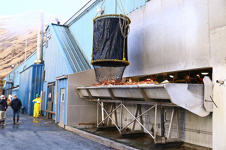 水揚げされたばかりの新鮮なカニは、荷揚げと同時に直接、クレーンで加工場へ搬入されます。