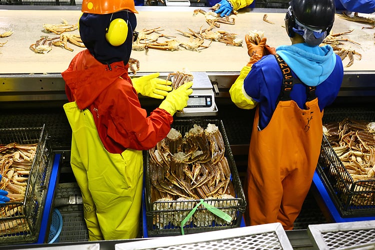 急速凍結したカニを、流れ作業で箱詰めしていきます。♪