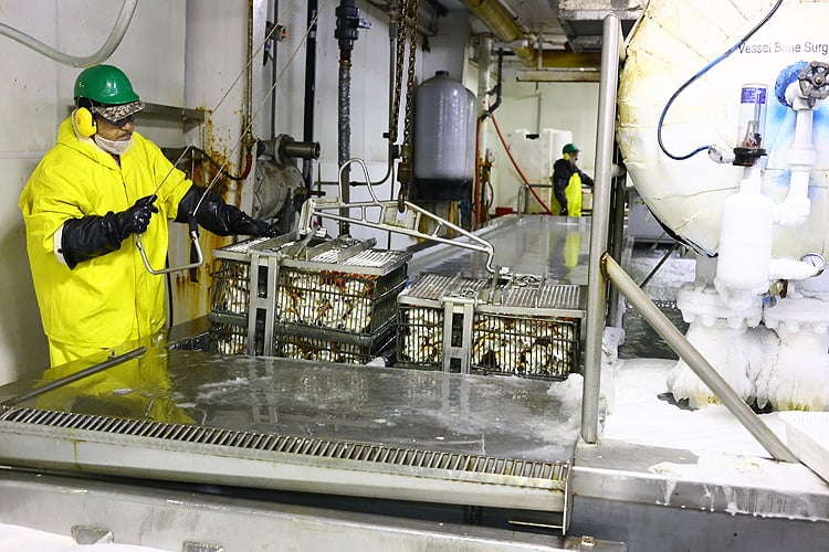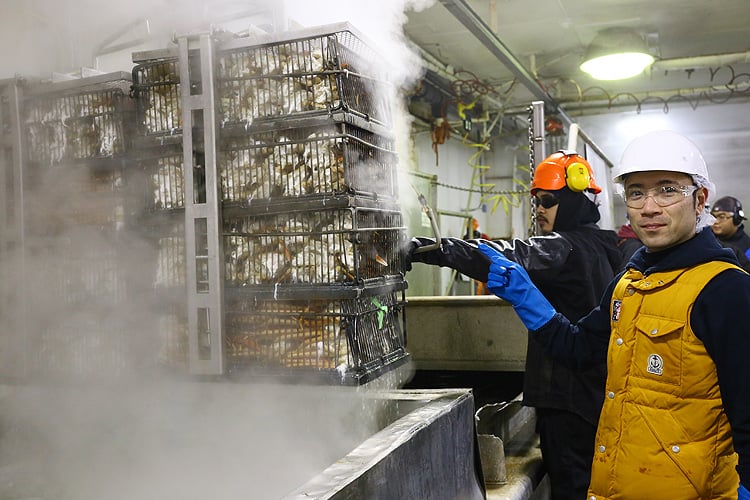 水揚げと同時に、「ブッチャー」と呼ばれる脱甲の作業から始まります。
