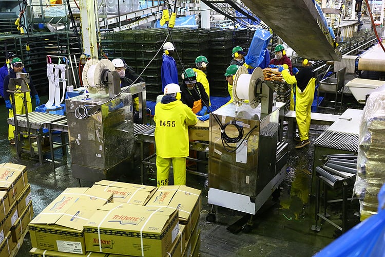 ここアラスカの工場では、甲羅が付いた丸ごと1匹ではなく、すべて足だけに加工されます。