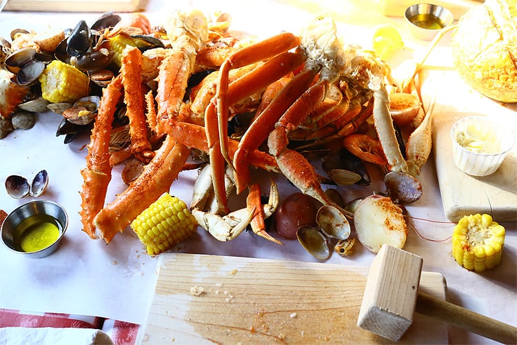 木製の木槌でボイルされたカニの殻を割って食べるスタイルのようです。