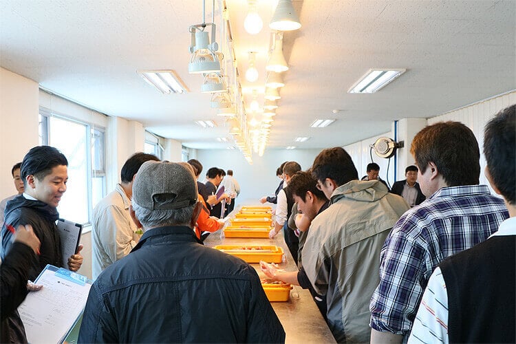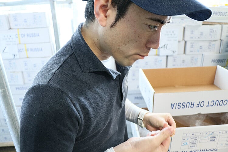 サイズは揃っているか?、色目はきれいか?(冷凍の緩みなどはないか?)、身入りはどうか?などを順番に細かく見ていきます。