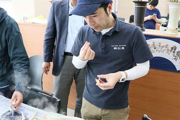 一通り検品が終わり事務所に帰ろうとエレベーターに乗ったら、同じビルの4階で助子(明太子の原料)の検品&入札会が開催されているとのこと。