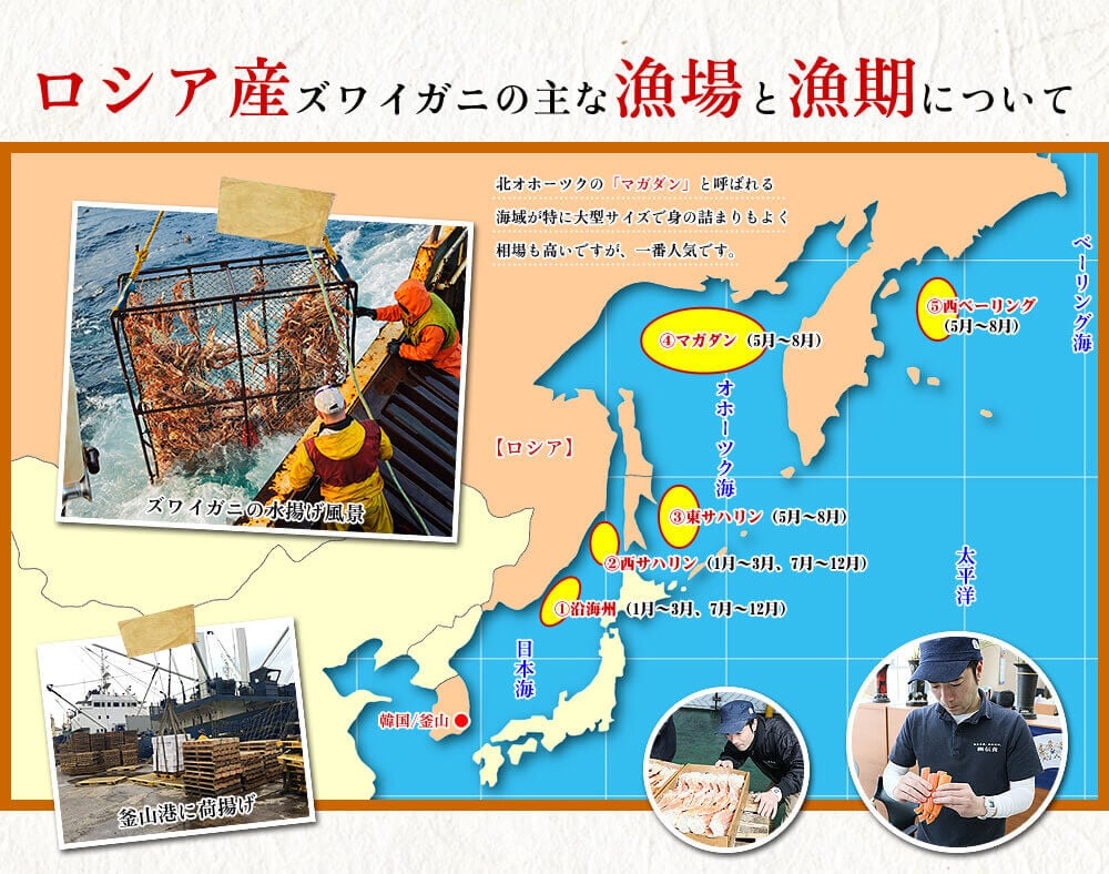 日本海のズワイガニ漁は11月~3月ですが、ロシア産ズワイガニの漁期は、ほぼ1年中です。