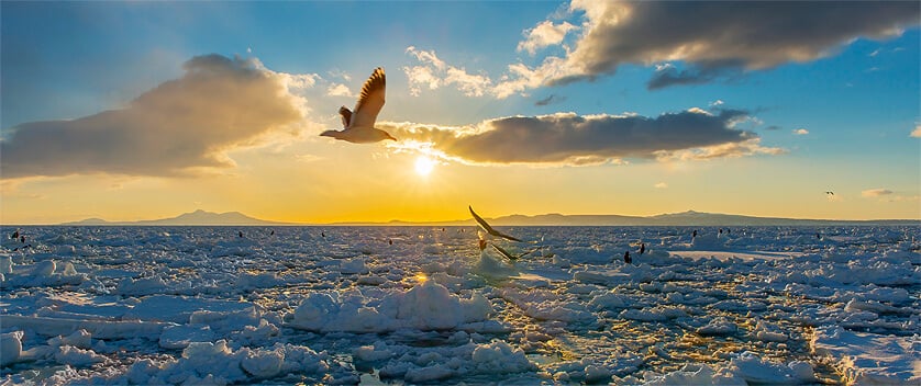 オホーツク海は1月中旬から2月いっぱい流氷に覆われることから、流氷が一定期間、海をふさぎ獲り過ぎによる資源の枯渇を防いでいます。また、流氷にはアイスアルジーというプランクトンの餌になる苔がつき、そのプランクトンが小魚を、そして小魚が大型魚類を連れてくる豊かな生態系が形成され、世界有数の好漁場となっています。