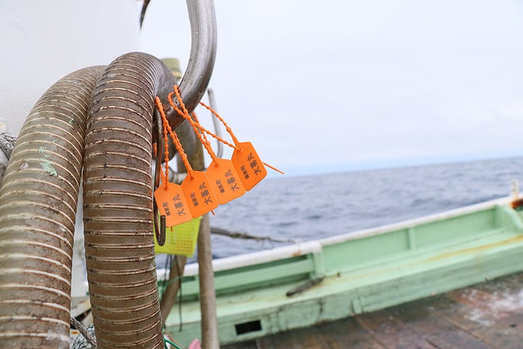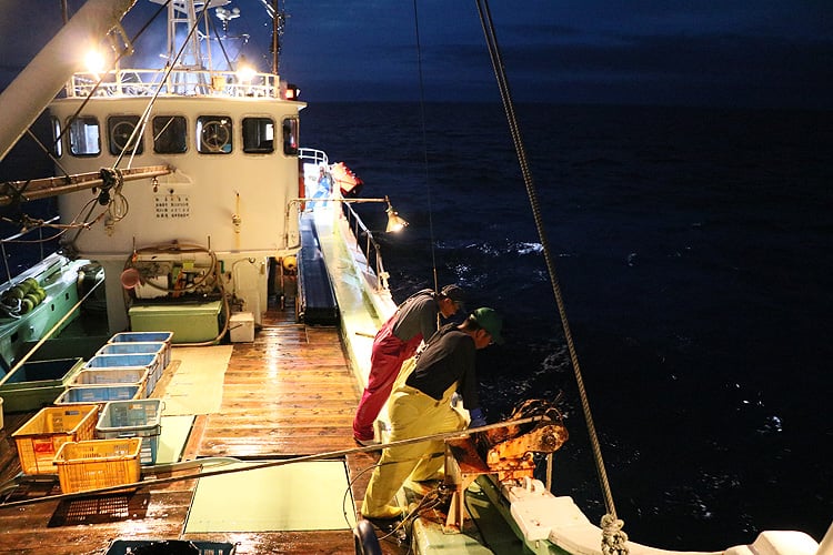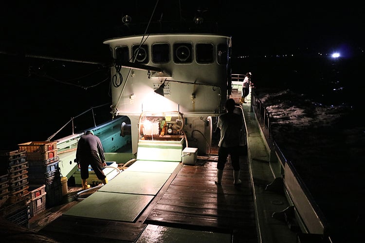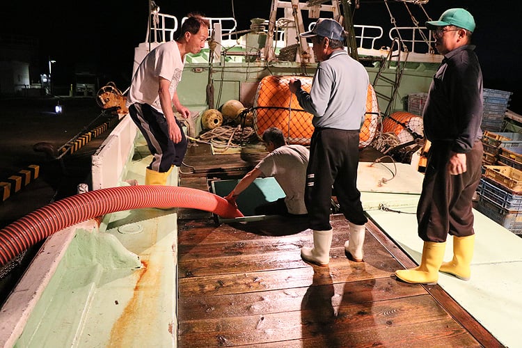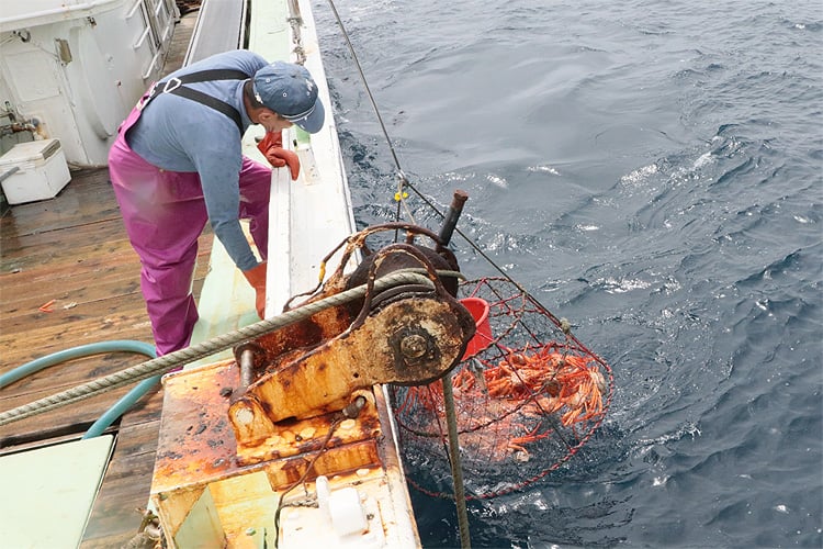 素人目からは豊漁に見えますが、先代の親方の時代は、1回の仕掛けで100コンテナほどの水揚げがあったそうです。