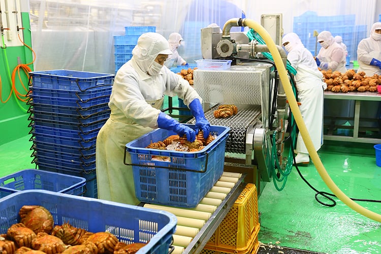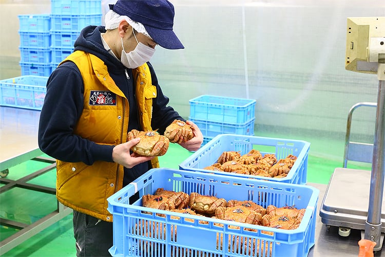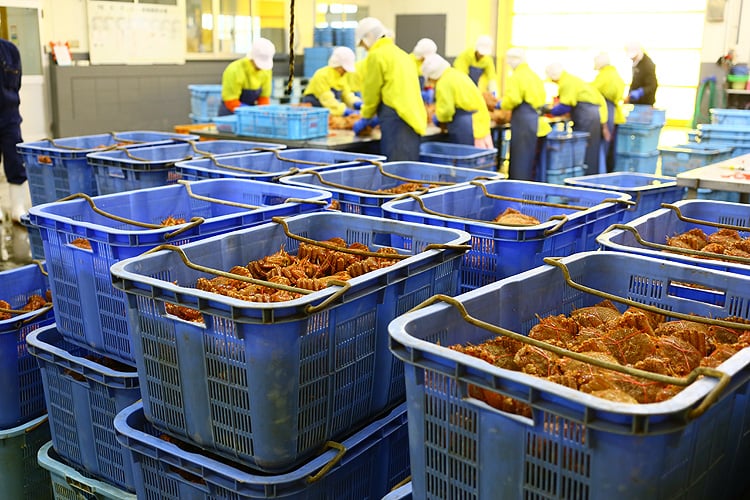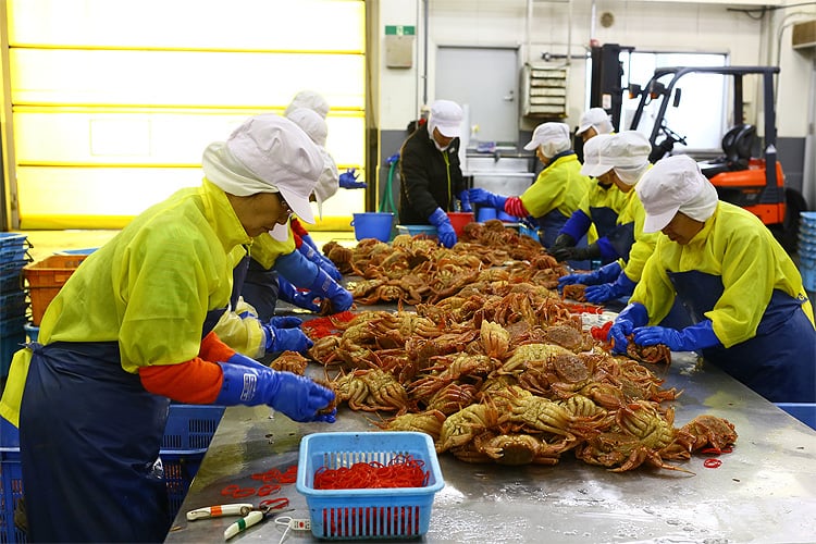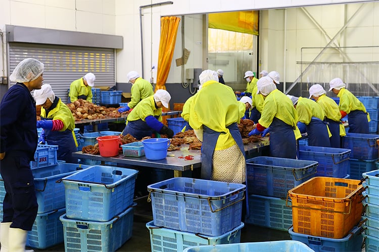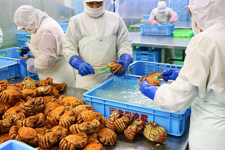 毛蟹の水揚げから高鮮度のまま工場に搬入し、ベテランの職人が手際良く製品化。