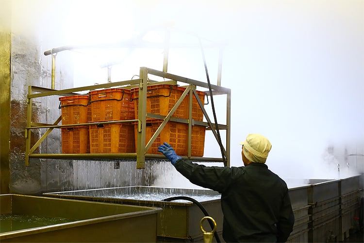 続いて【釜茹で】の工程です。専用の大釜を用いて高温で一気に茹で上げます。