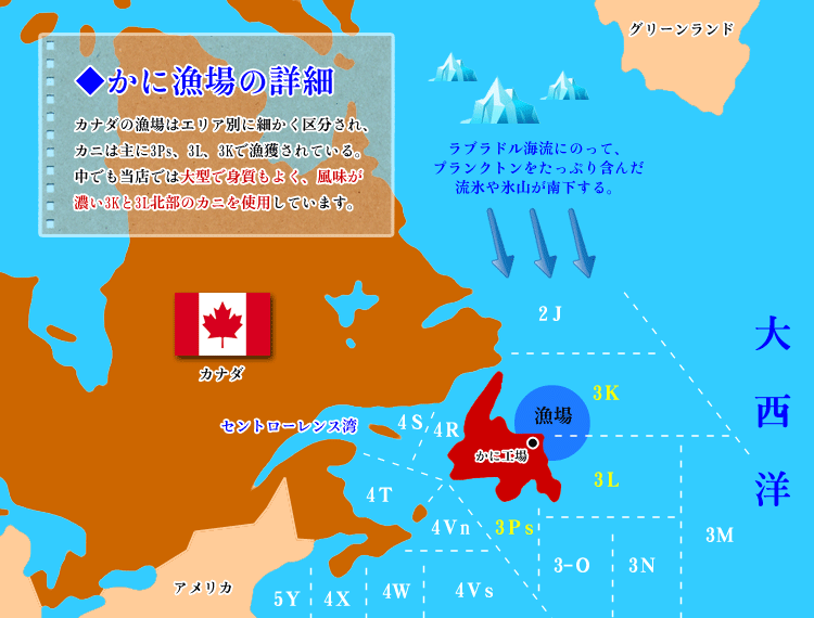 この漁業は、カナダの排他的経済水域(EEZ)内のニューファンドランド・ラブラドール沖で行われており、いくつかのカニ管理エリア(CMA)内の国際水域に隣接しています。今回の認証単位は、2J、3K、3L、3Psのエリア別に4つの単位に分けられています。 漁獲は、円錐形のカニかごを用い、地域や年によって異なるものの主に春先から開始されます。天候や氷の状態などで開始時期は変わりますが、これは交配の時期を避け、夏に脱皮直後の柔らかい甲羅を持つカニの漁獲を減らすためです。