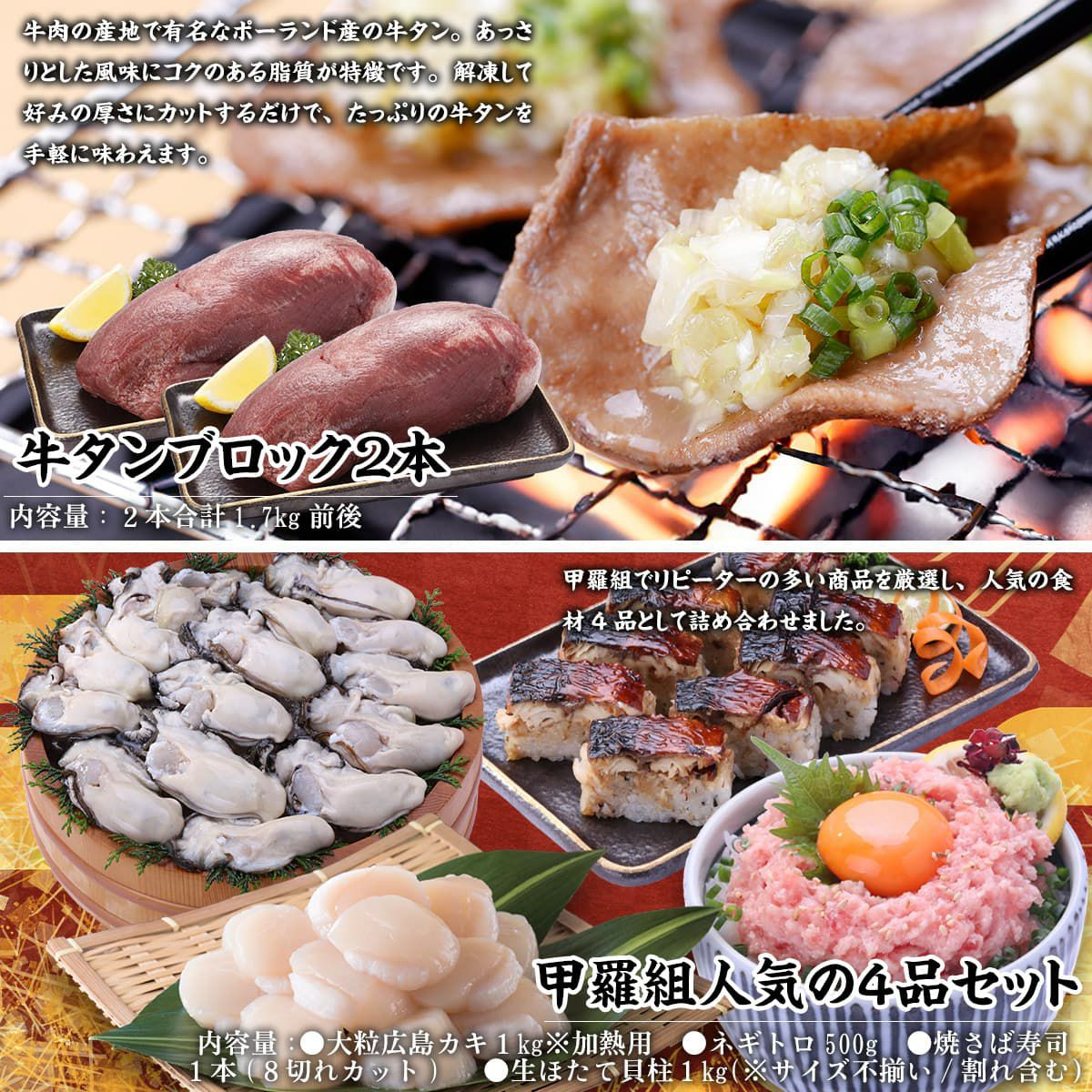他の画像を見る 人気商品4種の詰め合わせ♪ 甲羅組人気食材4種がお得に楽しめるよくばりセット 牡蠣 ほたて 貝柱 鯖寿司 すし ネギトロ マグロ 鮪 お歳暮 年末年始 送料無料 クール便(冷凍) 価格 ¥ 9,999 税込 詳細を見る お気に入りに登録する