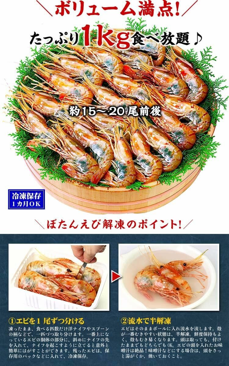 他の画像を見る 透き通る身と濃厚なエビ味噌が高鮮度の証! 子持ちぼたんえび1kg(約15~20尾前後) 送料無料 クール便(冷凍) 価格 ¥ 11,999 税込 在庫切れ 詳細を見る お気に入りに登録する